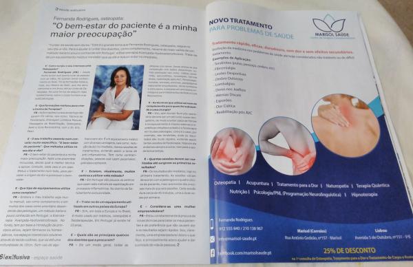 Por um imperativo de consciência quero dar o meu testemunho público à prática de bons serviços de saúde. Estou a referir-me à Fernanda Valadas Rodrigues da Clínica Marisol Saúde – Centro de Terapias Complementares. Já por diversas vezes recorri aos competentes serviços da Fernanda Rodrigues. Ultimamente uma dor persistente nas costas levou-me a procurar a Fernanda. Um rapaz como eu que é do tempo em que se jogava ao pião e se